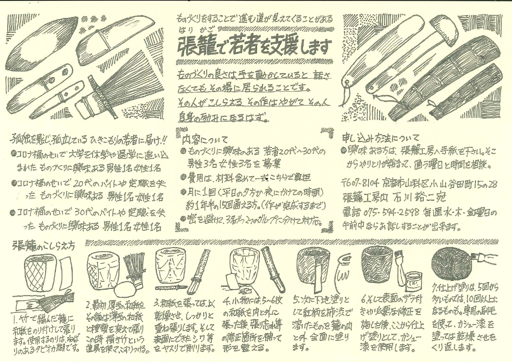 参加の申し込みは張籠工房へ手紙をいただくか、下の電話かお問い合わせフォームよりご連絡下さい