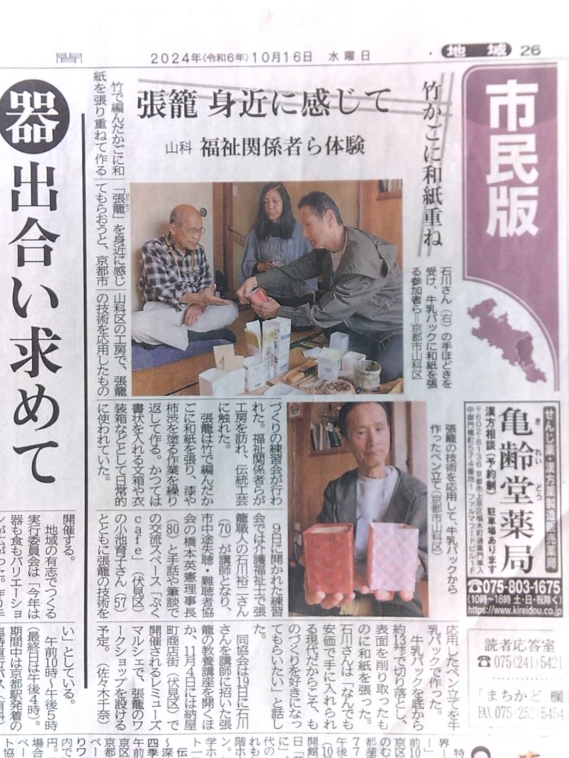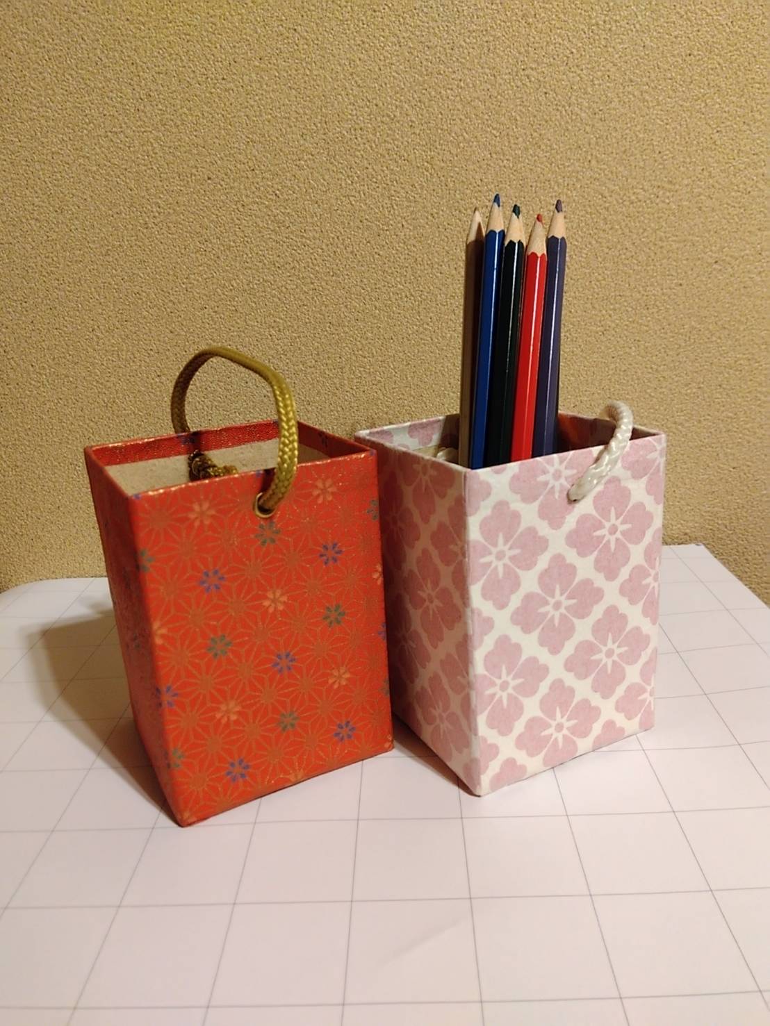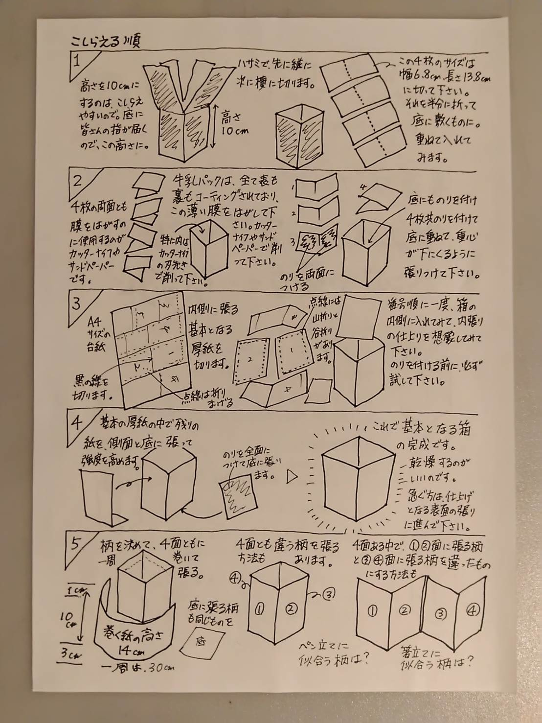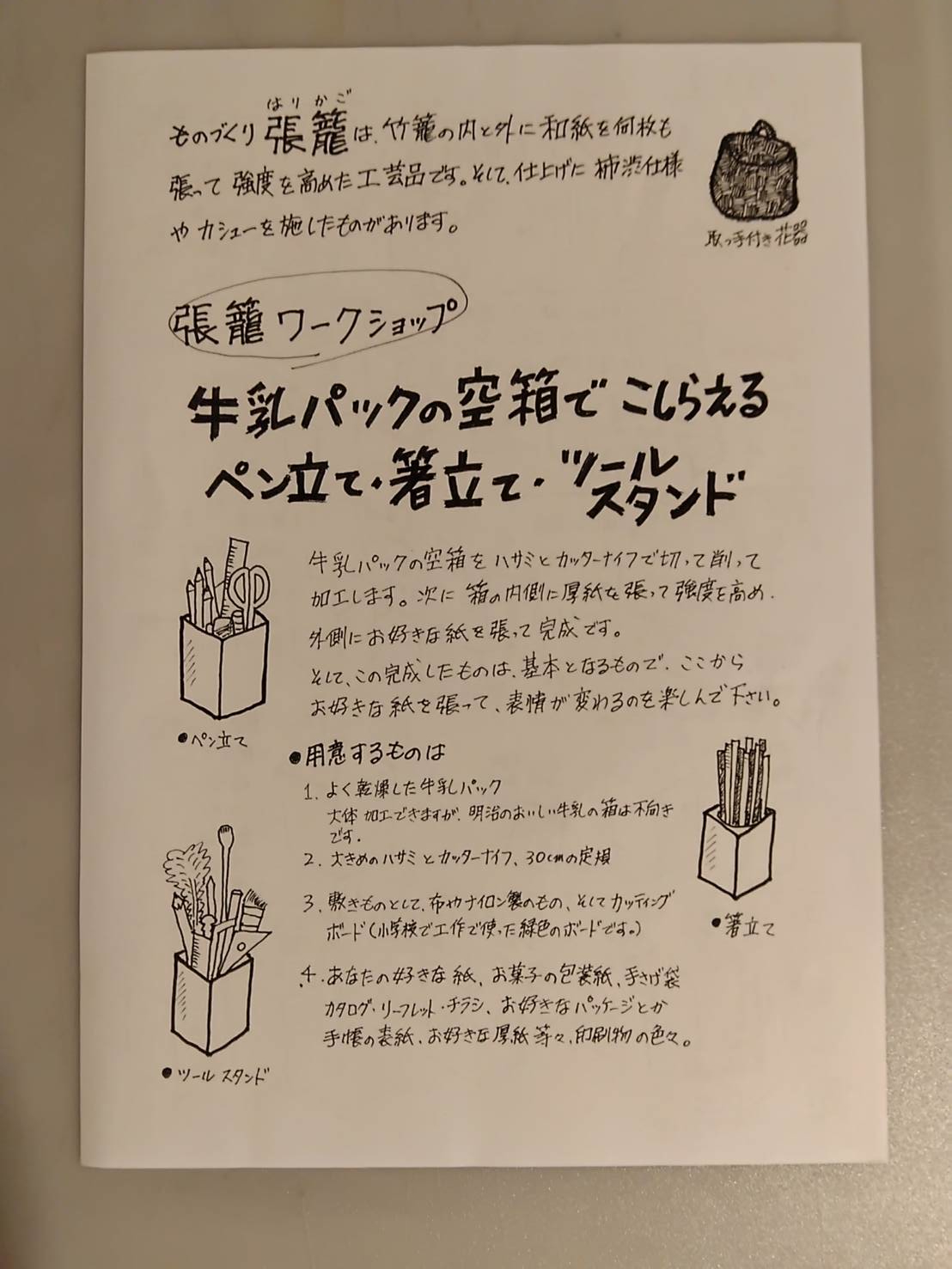 牛乳の空き箱を加工して、和紙を外に、再生紙を内に張って、ペン立て(あるいは箸立て、ツールスタンド)をこしらえます。 半日から1日の工作を楽しく一緒に過ごしましょう。